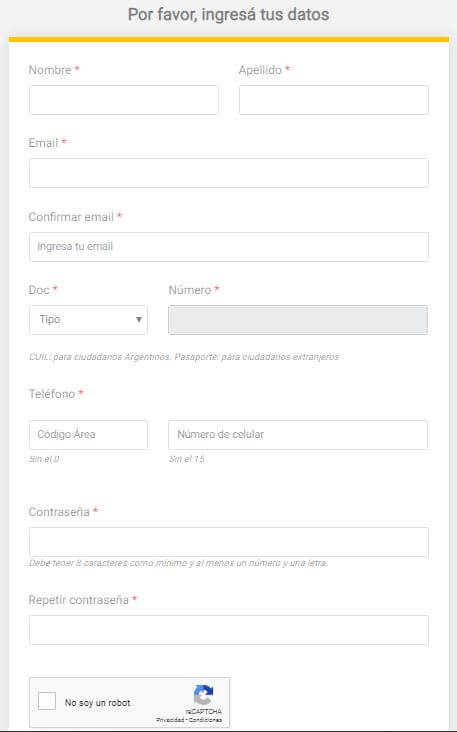Una vez que hagas clic en el botón, te pedirán que completes tus datos personales. Recuerda que tienes que saber tu CUIT o tu CUIL para darte de alta, no alcanza con el documento. Para saber tu CUIL o CUIT con tu DNI te recomendamos éstas guías: